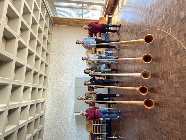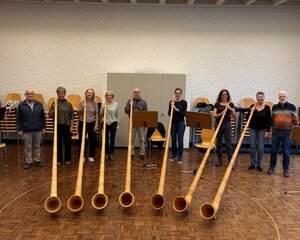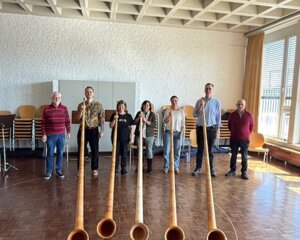 An vier Samstagmorgen fand im Singsaal Hermolingen ein Alphornschnupperkurs statt. Unter der engagierten Leitung von Sep und Heinz wagten sich die Teilnehmenden an das ungewohnte Instrument. Vorab erzählte Sep etwas über die lange Geschichte des Alphorns doch schon bald stand die bewusste Atmung, das passende Mundstück und das Hören der drei Töne im Fokus.