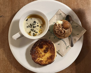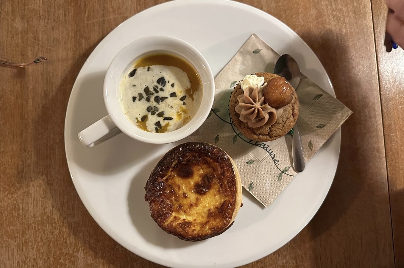 Mit einem feinen Drink und einem kulinarischen Trio aus Kürbissuppe, Käseküchlein und einem Marroni-Muffin verwöhnte uns Alexandra im Café Umbels.